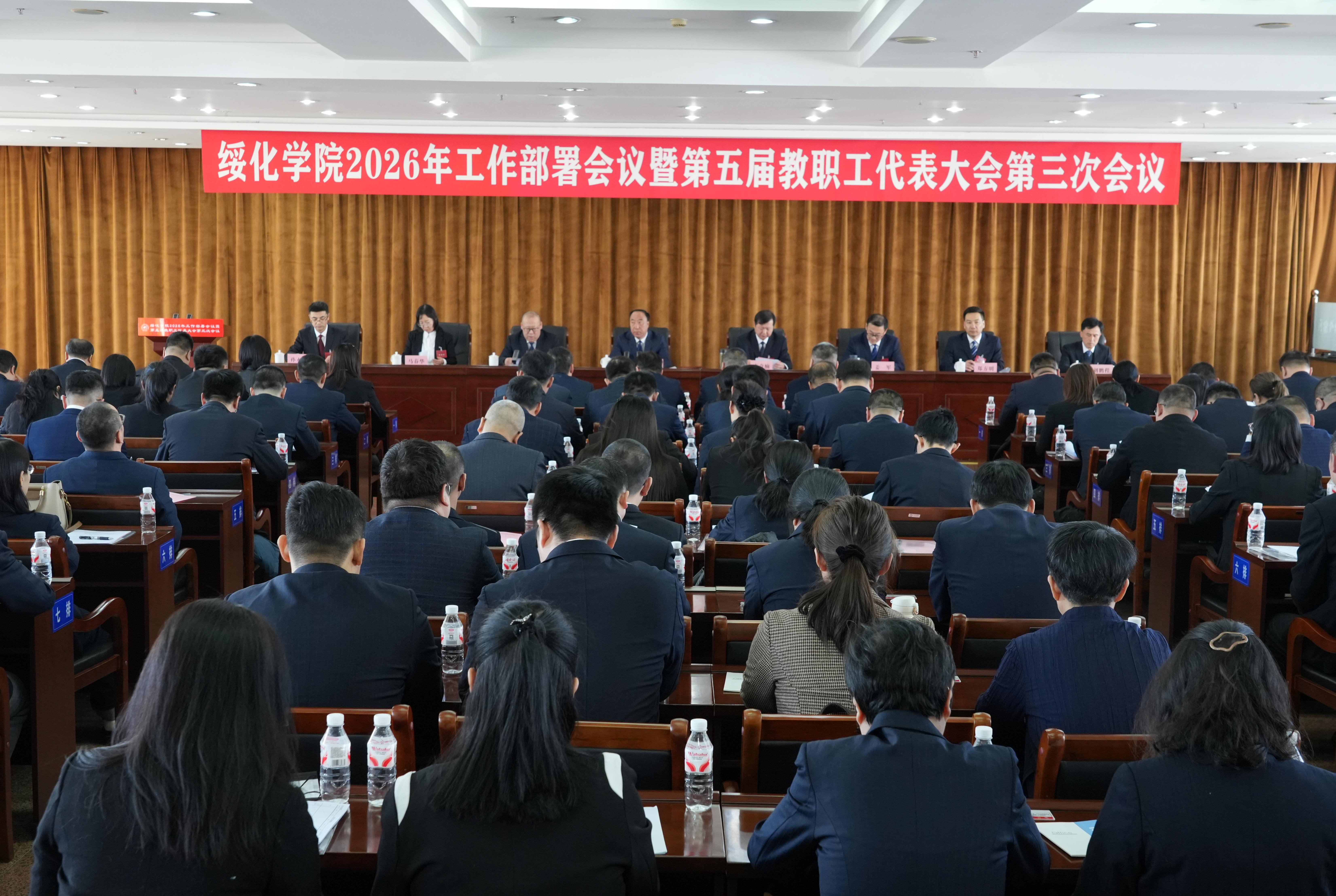2月26日下午,學校2026年工作部署會議暨第五屆教職工代表大會第三次會議在厚德樓A502會議室召開。黨委書記劉峰出席會議并講話,院長李奇楠作工作報告并部署2026年工作,校領導姜軍、馬春華、鄭方明、孫永剛、劉鵬程出席會議,黨委副書記盧百勝主持會議。